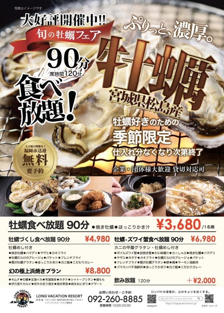 焼き牡蠣はもちろん、牡蠣料理も揃えた“牡蠣好きのための季節限定”フェアです。※仕入れ分なくなり次第終了/食べ放題90分(席時間120分)