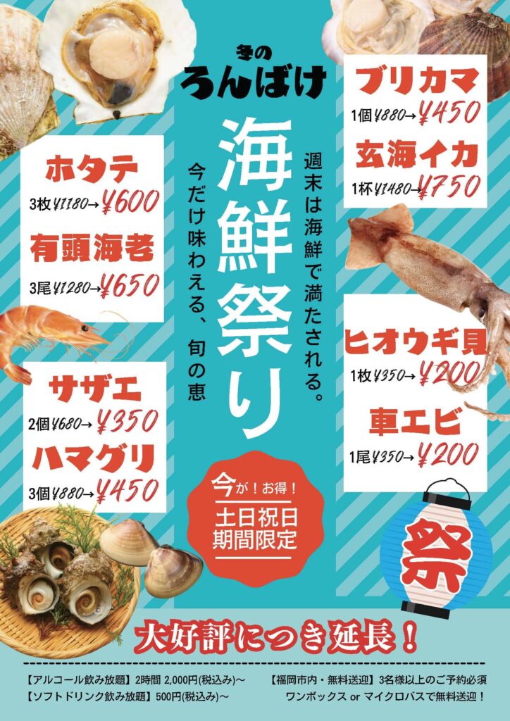 【土日祝日・期間限定】冬のろんばけ 海鮮祭り(大好評につき延長!)週末は海鮮で満たされる。今だけ味わえる、旬の恵み。